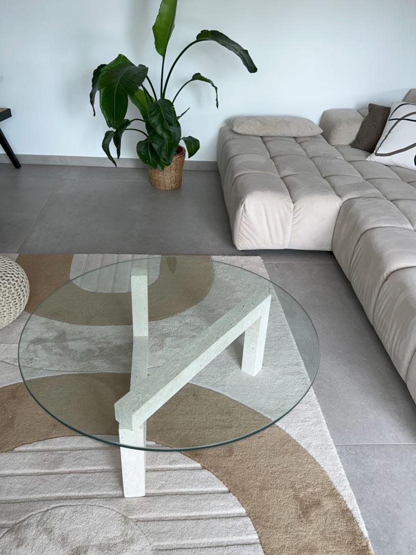 Plongez dans le luxe intemporel avec notre magnifique table basse ronde avec ses pieds en travertin et son plateau de verre, un chef-d'œuvre artisanal qui évoque le charme envoûtant de la ville légendaire de Casablanca.
