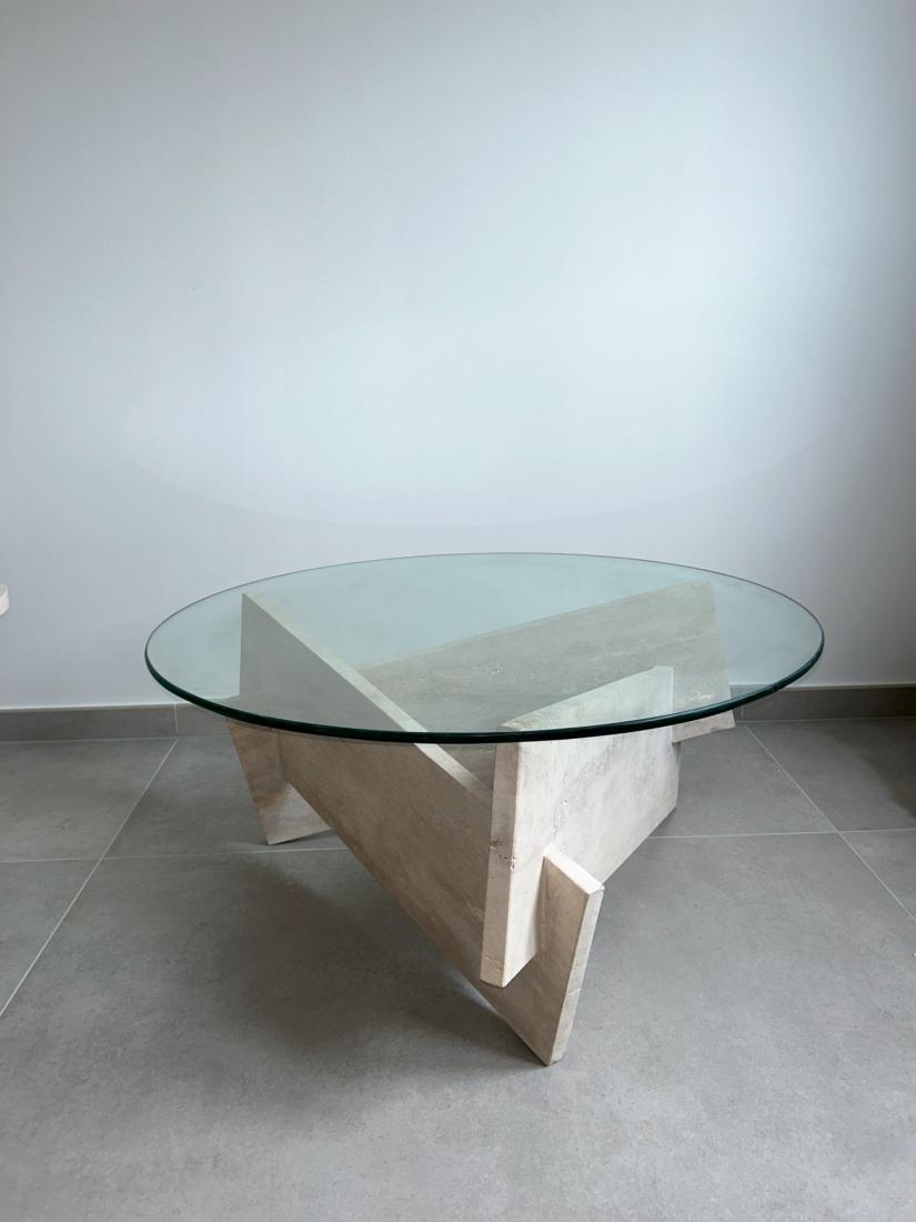 Cette pièce exceptionnelle marie l'élégance du travertin à la transparence délicate du verre, créant ainsi une œuvre d'art fonctionnelle qui respire la sophistication italienne.