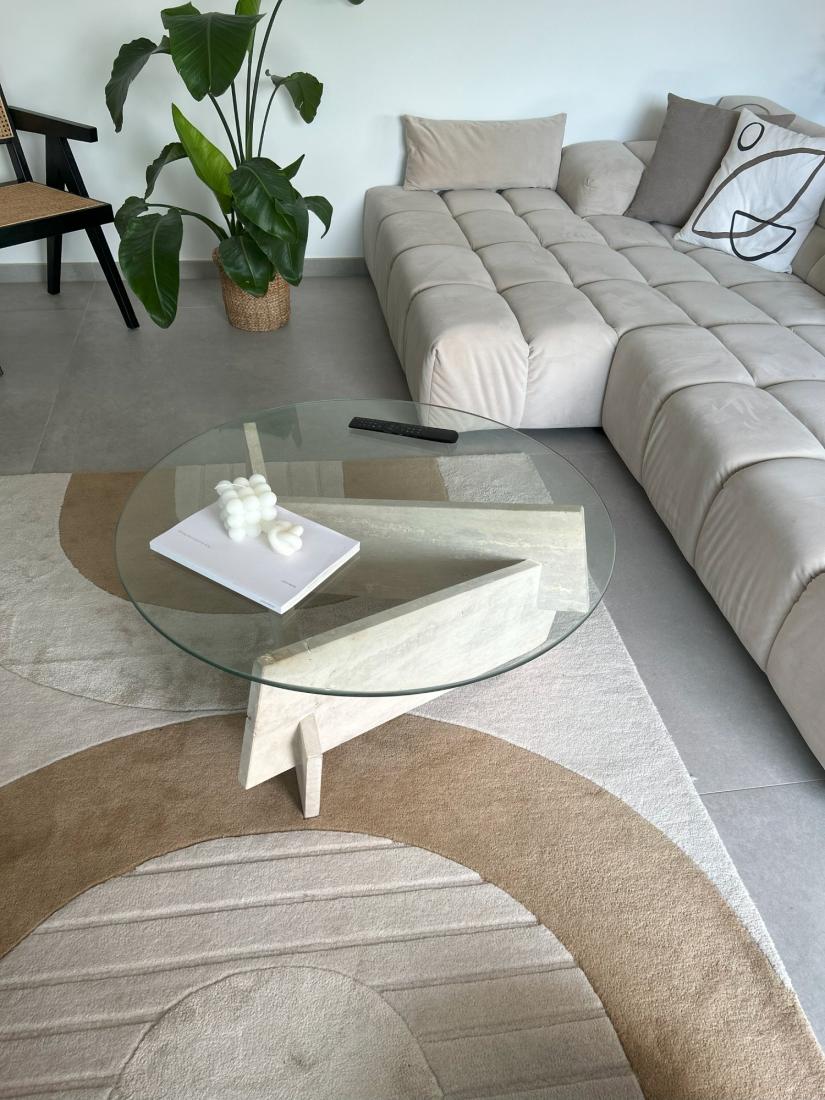 Le mariage du plateau en verre translucide et des pieds en travertin évoque une harmonie visuelle parfaite.