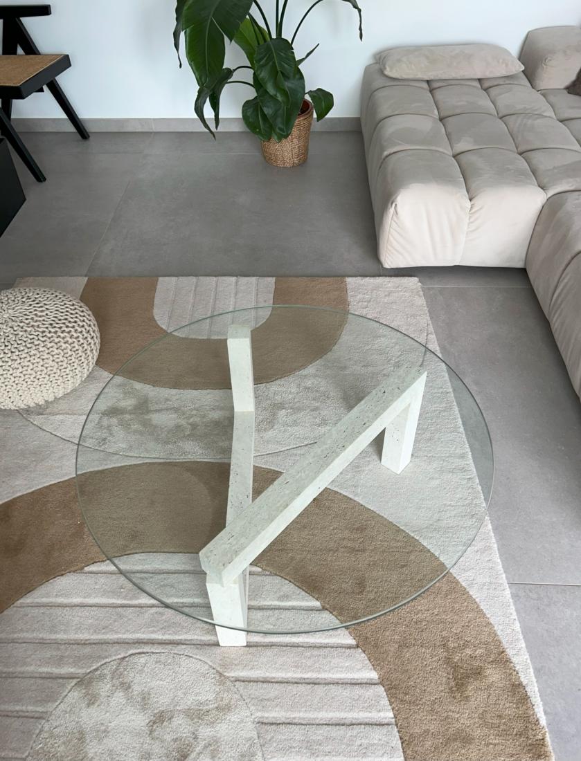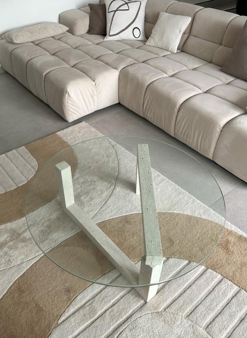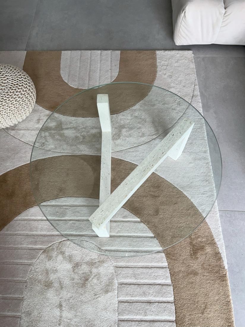 Cette pièce unique allie la beauté naturelle du travertin à un design élégant grâce au verre, créant ainsi une harmonie parfaite entre modernité et tradition.