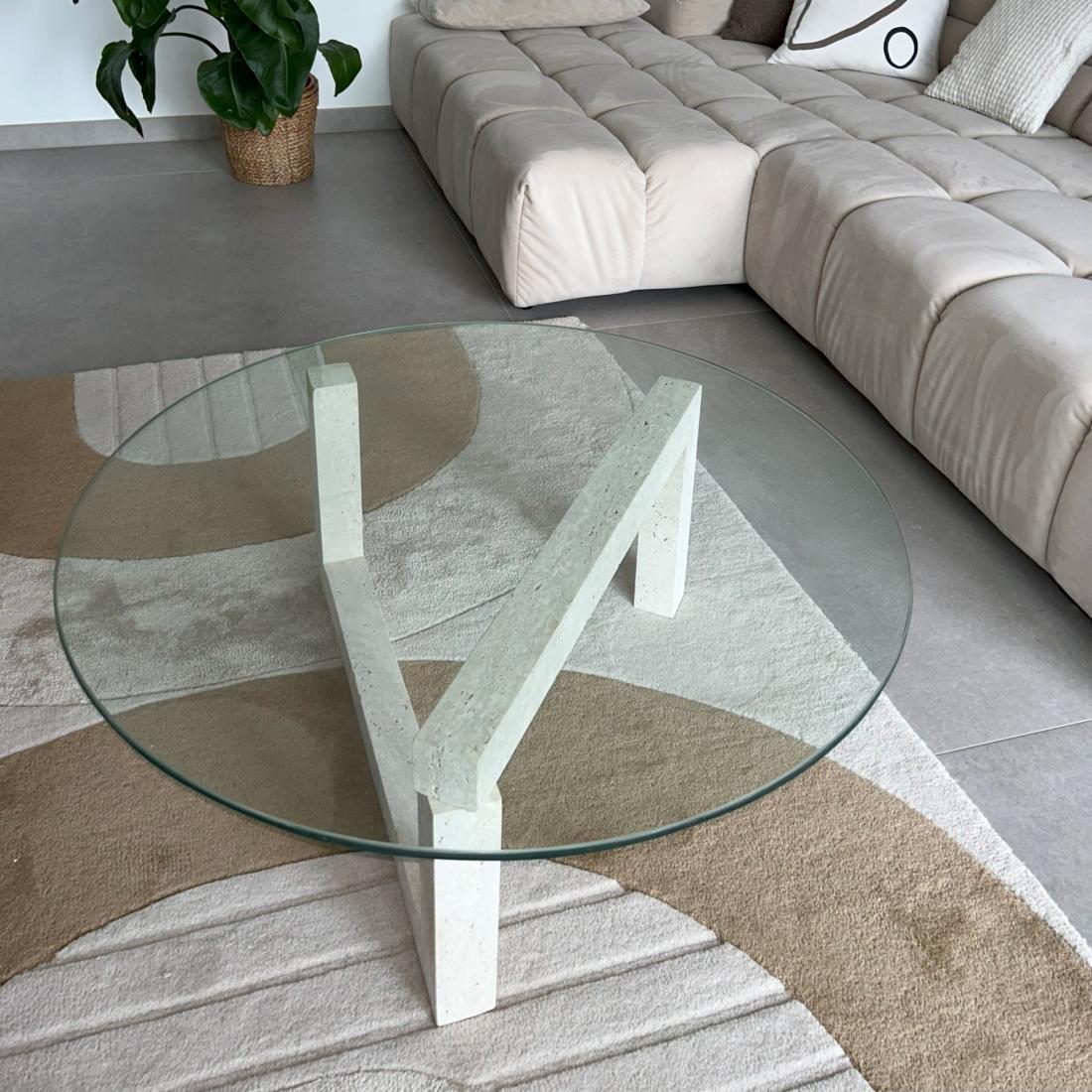 Plongez dans le luxe intemporel avec notre magnifique table basse ronde avec ses pieds en travertin et son plateau de verre, un chef-d'œuvre artisanal qui évoque le charme envoûtant de la ville légendaire de Casablanca.
