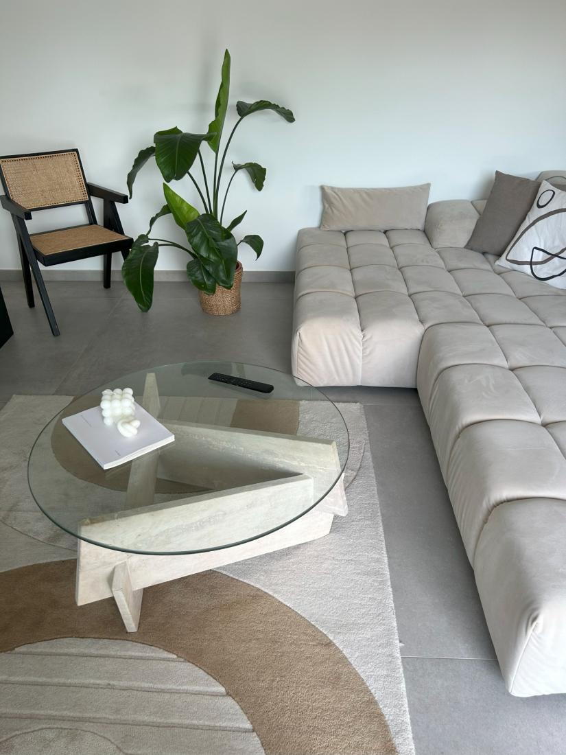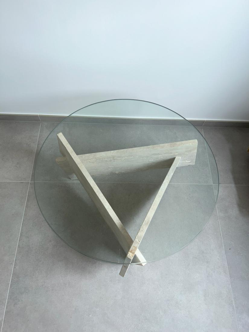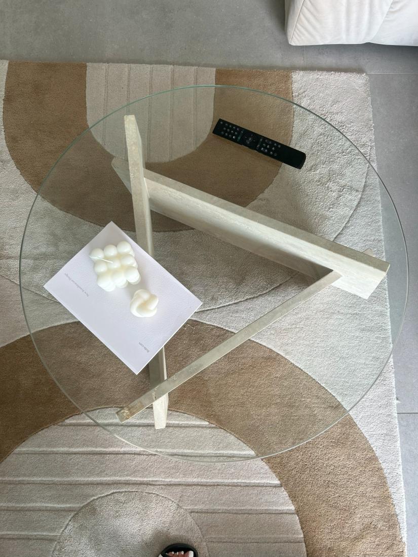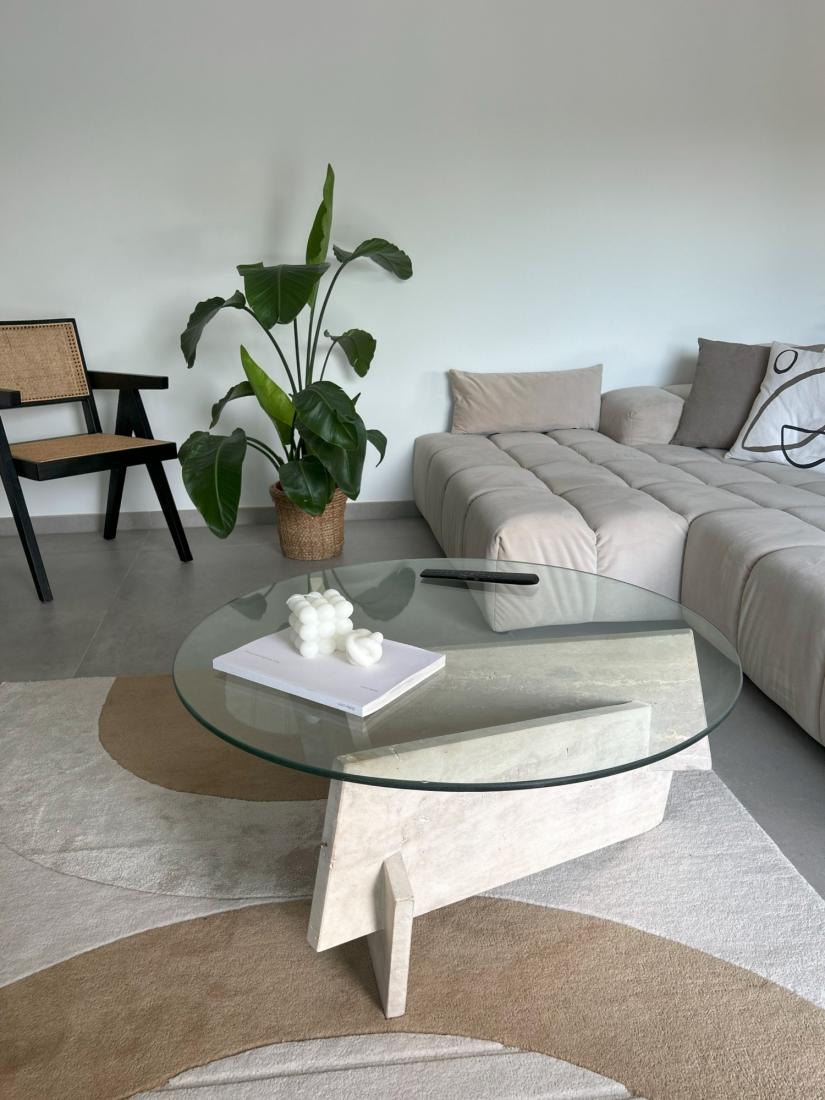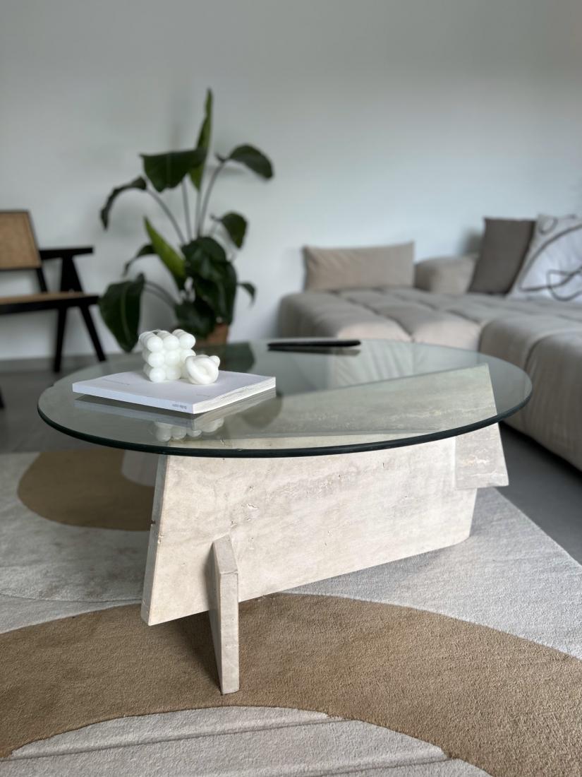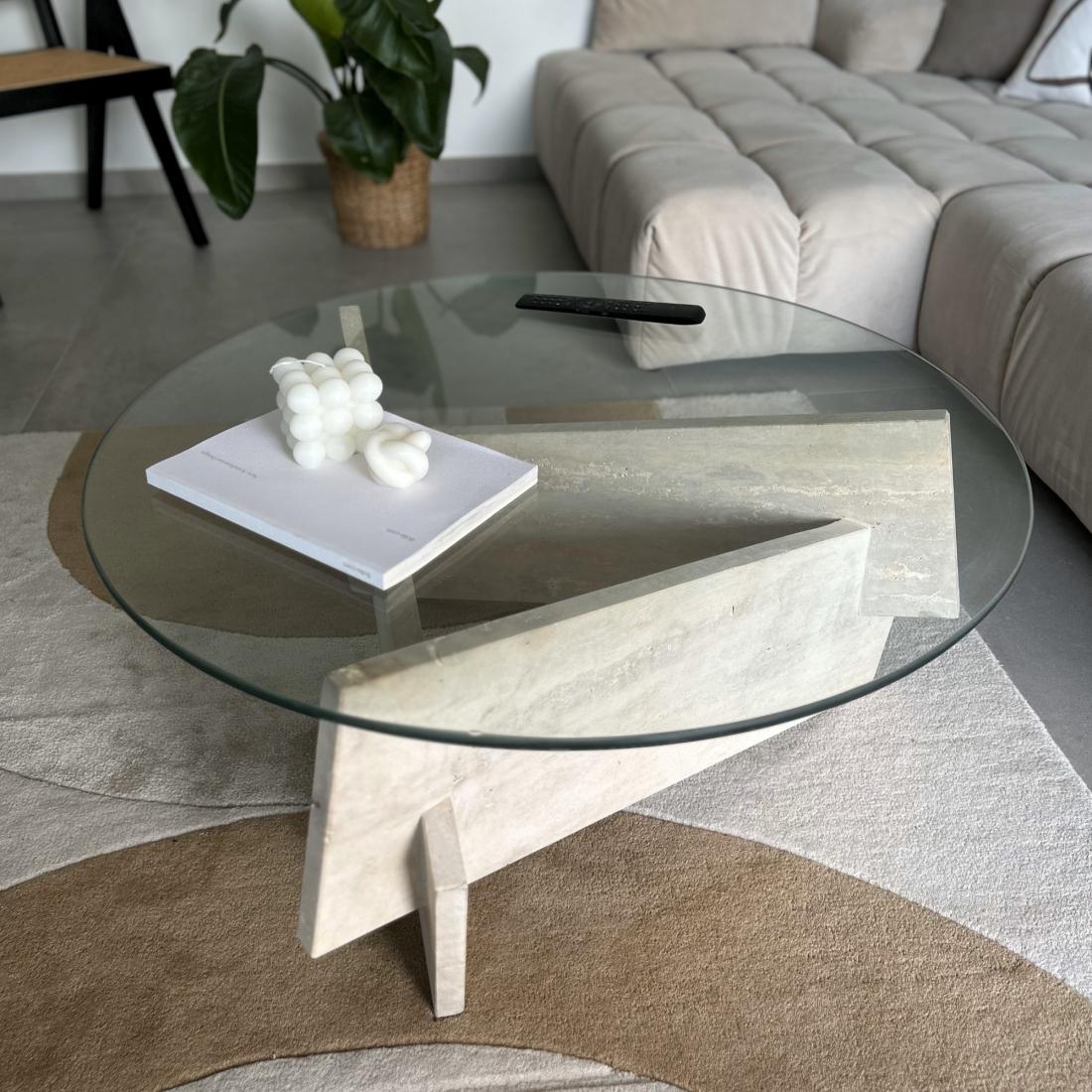 Le mariage du plateau en verre translucide et des pieds en travertin évoque une harmonie visuelle parfaite.